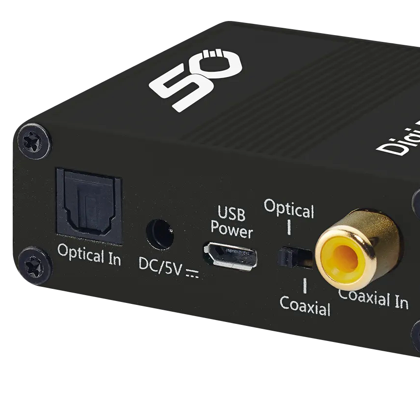 DAC:en omvandlar högupplöst ljud via en koaxial- eller optisk ingång. Inuti enheten tar Cirrus Logic över den förlustfria omvandlingen från digital till analog i 192 kHz/24 Bit.